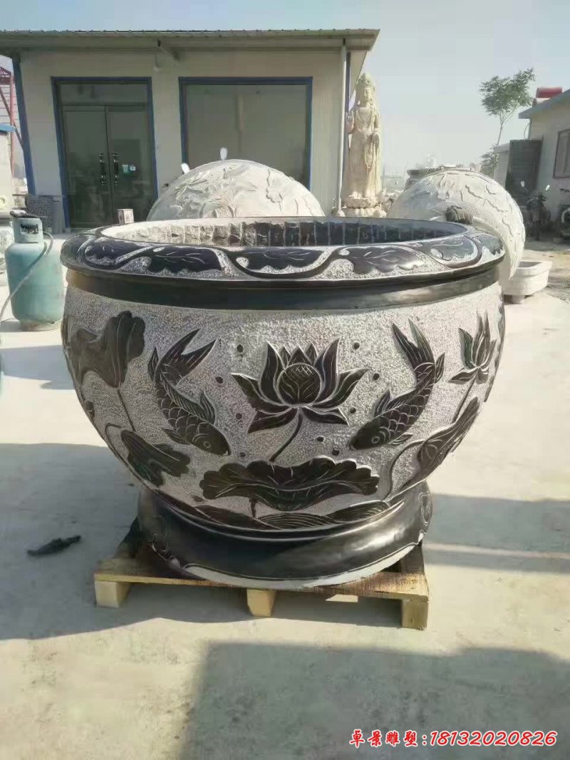 園林荷花鯉魚石浮雕水缸