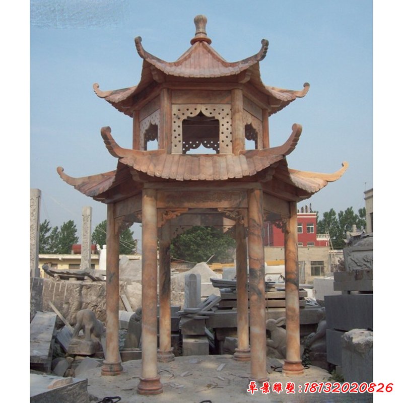 雙層涼亭石雕晚霞紅涼亭雕塑