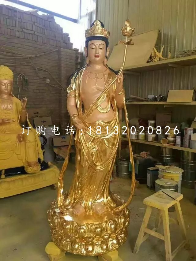 大勢至菩薩,又稱得大勢菩薩或大精進(jìn)菩薩,簡稱為勢至。大勢至是梵文Mahās-thāmaprāpta的意譯。音譯為"摩訶那缽"。據(jù)《悲華經(jīng)》卷二稱,刪提嵐世界的無諍念王有一千個(gè)兒子,長子名不眴,次子名尼摩。后無諍念王成佛為阿彌陀如來,不眴太子為觀世音菩薩。而尼摩太子則成了大勢至菩薩。菩薩跟隨佛學(xué)法修菩薩行,經(jīng)過許多階段之后,才可成佛。菩薩中經(jīng)歷所有的階段達(dá)到最高位的菩薩,就是一生補(bǔ)處菩薩。只要結(jié)束菩薩生涯,在下一階段的生涯中就定可成佛。若以三尊的形式表現(xiàn)佛陀時(shí),必有一生補(bǔ)處菩薩隨侍左右,且組合是一定的。阿彌陀佛其左右脅侍的就是觀世音菩薩和大勢至菩薩,三位合稱"西方三圣"或"阿彌陀三尊"。
