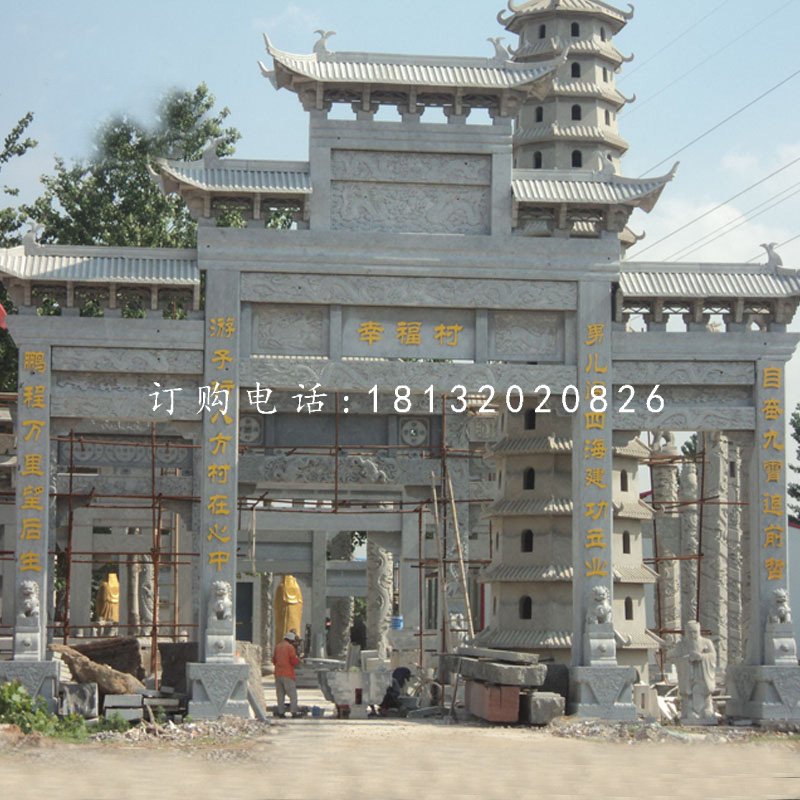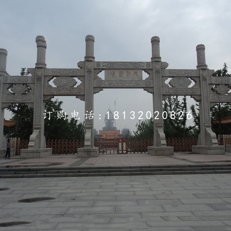 石雕牌坊按照開門數一般可分為三門、五門、七門。草白玉、青石、漢白玉以及花崗巖這些石材成為制作石雕牌坊的主要石材。牌坊周身布滿浮雕圖案,雕刻工藝精美細膩。常見的瑞獸圖案有龍、鳳、麒麟、鹿(諧祿)、魚(諧余)等。另外有荷花、牡丹、松鶴、梅蘭竹菊代表著健康長壽、平安幸福。石雕牌坊頂部的結構造型主要有坊式和樓式兩種,樓式結構的頂部結構復雜,斗拱以及樓瓦的配合使得整體氣勢恢宏。坊式結構頂部則沒有了斗拱、樓瓦這些構件,顯得簡單大方。