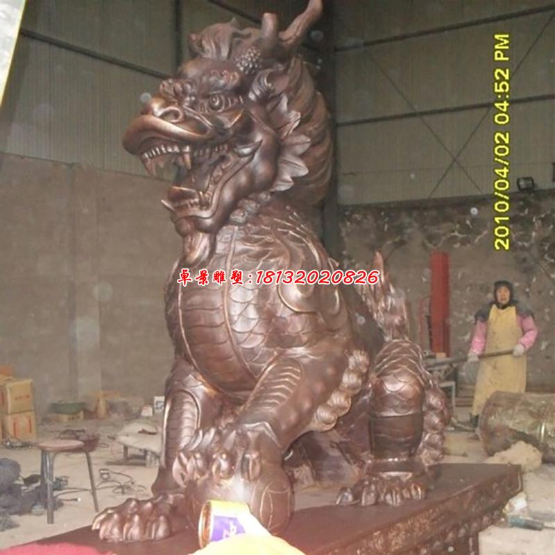 傳說,銅麒麟是上古時期的圣獸,有祥瑞之意。關于銅麒麟的雕刻傳說有很多,其中最動人的傳說就是麒麟送子傳說。銅麒麟其中麒雕刻成雄性生物,麟雕刻成雌性生物,身體是鹿身,尾巴是牛尾,頭是狼頭,而且生有四個犄角。銅麒麟外表威風凜凜,雄壯威武,有鎮宅辟邪的作用,同時,始終代表著仁義之獸、神圣之獸。