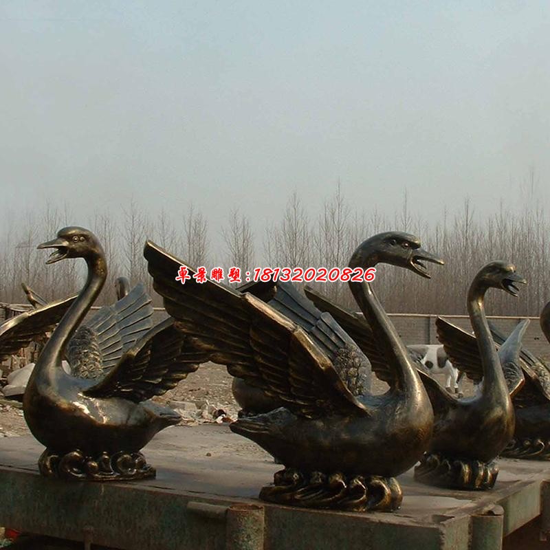 鵝鵝鵝,曲項向天歌,白毛浮綠水,紅掌撥清波.駱賓王的一曲詠鵝流傳至今 ,天鵝的羽色潔白,體態優美,叫聲動人,不禁的叫人喜歡。在 許多的景區綠地上都喜歡放有一些天鵝雕塑 ,還有在噴水的景觀上面也常用到天鵝雕塑。制作天鵝銅雕一般常用的就是漢白玉雕塑。漢白玉顧名思義,通體潔白 ,晶瑩透徹,擦亮后更是圓潤光滑,敬賢尊貴。