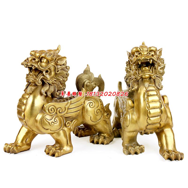 傳說銅雕貔貅是龍生九子的第九子,能騰云駕霧,號令雷霆,降雨開晴,更兼有辟邪擋煞,鎮宅之威力。龍生九子,神通不一。其子貔貅,勝父千倍,長大嘴,貌似金蟾,甲形如麒麟,取而獸之優,有口無尻,吞萬物而不瀉。可招財聚寶,只進不出,神通特異。傳銅雕貔貅因為觸犯天條,玉皇大帝罰他只許吃不許拉。所以貔貅是以財為食的,納食四方之財,肚子聚財催官運。