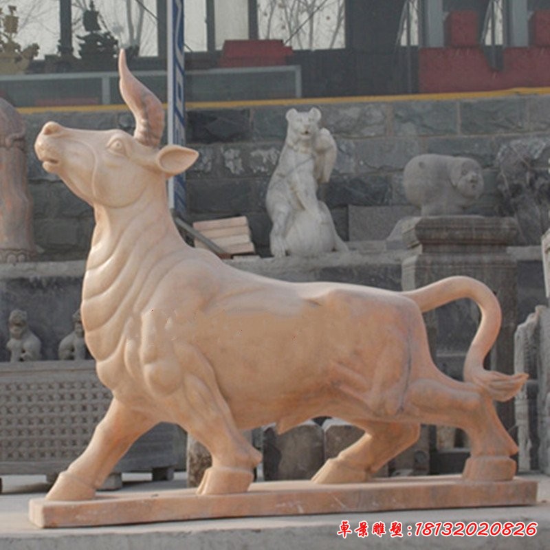 石雕牛顧名思義就是用石頭加工而成的牛的雕塑品。牛是體型粗壯,角中空,由頭骨向兩側呈大弧度伸出。力大,能耕田、拉車的哺乳動物。古有青牛降人間的傳說,牛來到人間后在田野默默耕耘,給人類帶來了物質的財富,它代表了一種默默奉獻、無私勤勞的精神。石雕牛的出現代表著人們對牛這種無私勤勞、默默奉獻、無怨無悔精神的歌頌及傳承。同時石雕牛有一種裝飾作用,裝飾著我們的城市、我們的生活,可以擺放在園林、城市中心、宗廟、企業門口、學校、公園、小區、商場等地,能夠提供相得益彰、珠聯璧合的效果。另外,石雕牛除了裝飾的作用外,還有一定的寓意,不同的石雕牛的寓意也是不同的,例如:美國紐約證券交易所門前的石雕牛,人們以此牛來比喻證券行情的牛市發展,是人們看好牛市的一種心理和愿望,代表的是順利和幸福;牧童牛,富有動感,體現了一種田園詩意,給人的感覺是輕松愉悅,能夠凈化人的心靈;石雕拓荒牛,代表著辛勤勞作,心情播種,代表著收獲的人們。石雕牛的種類繁多,不同種類的石雕牛其意義也有所不同。